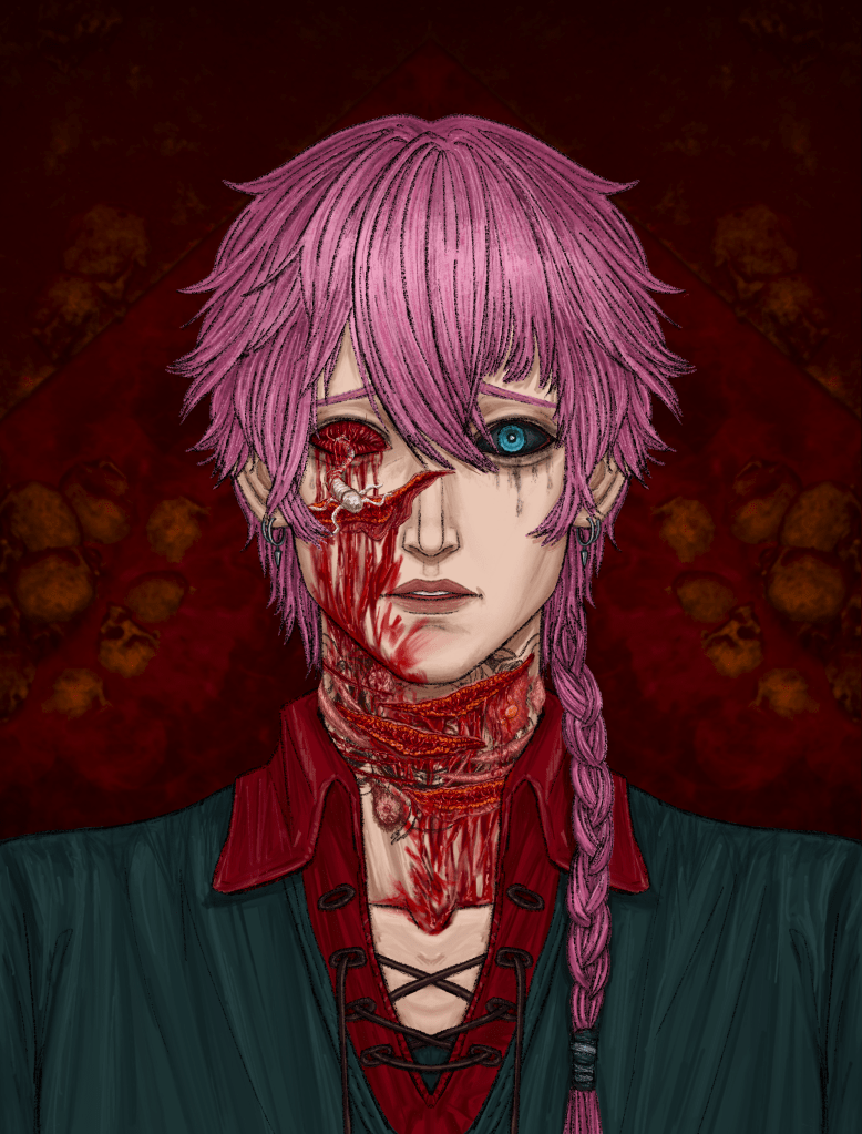 师父手中的匕首从他的鼻梁下刀,用尽全力划开的长长伤口极险地贴着眼窝游走,直到在颧骨处滑脱,血色的尾巴一直延伸进鬓角。利刃没有就此停止破坏,它堪堪擦过耳廓,毫不留情地斩断了所经之路上一切发丝。一缕缕粉色的长发掉在他的脚边,在石砖地面上散开,或在血泊中纠缠成黏稠的一团。他能听见头发落地时极轻的沙沙声,比两人粗重的呼吸更刺耳,比自己吃痛时的抽气更难堪。